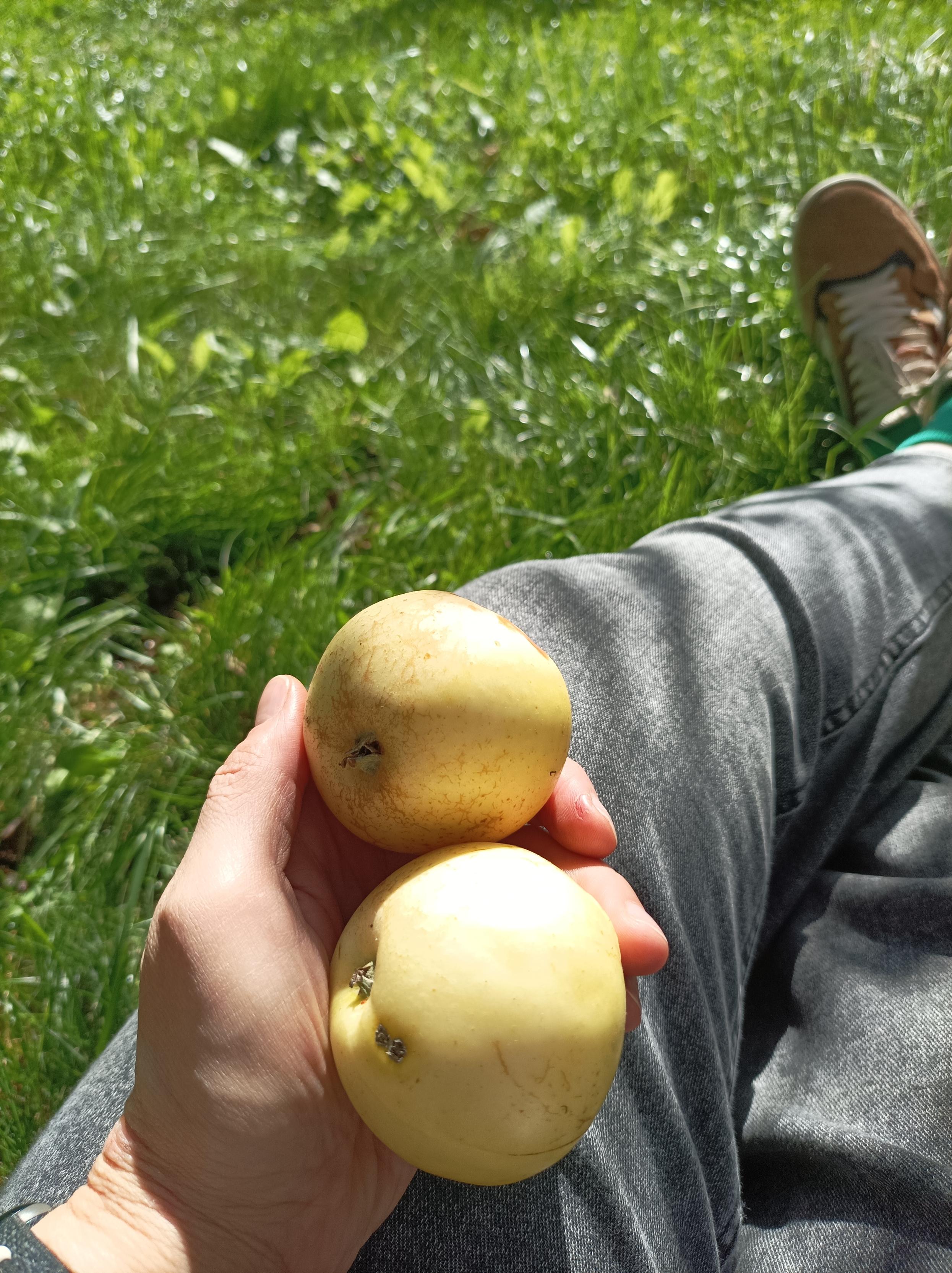 Friday morning I was sitting under an apple tree, unemployed, looking at the world, thinking of nothing. The world consisted of an apple tree and people who gathered apples from it with special devices on long sticks. One of them, an old man, gave me two apples and said: "Take them, they are the last ones, just bird-bitten a little."